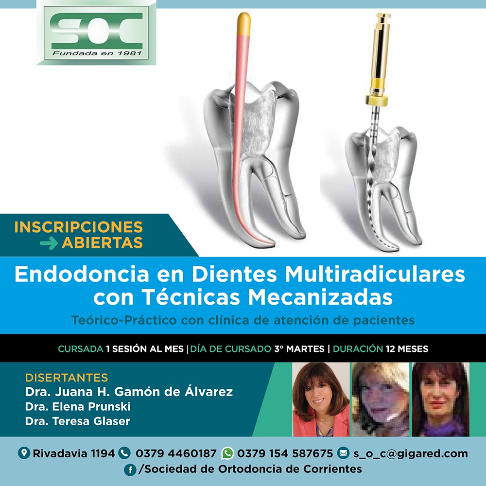 La Sociedad de Ortodoncia de Corrientes (SOC) organiza una nueva edición del Curso de Endodoncia en Dientes Multiradiculares con Técnicas Mecanizadas. Se trata de una oferta de capacitación con modalidad interactiva y dinámica, de práctica intensiva, que tendrá una duración de 12 meses. Las inscripciones se encuentran abiertas.